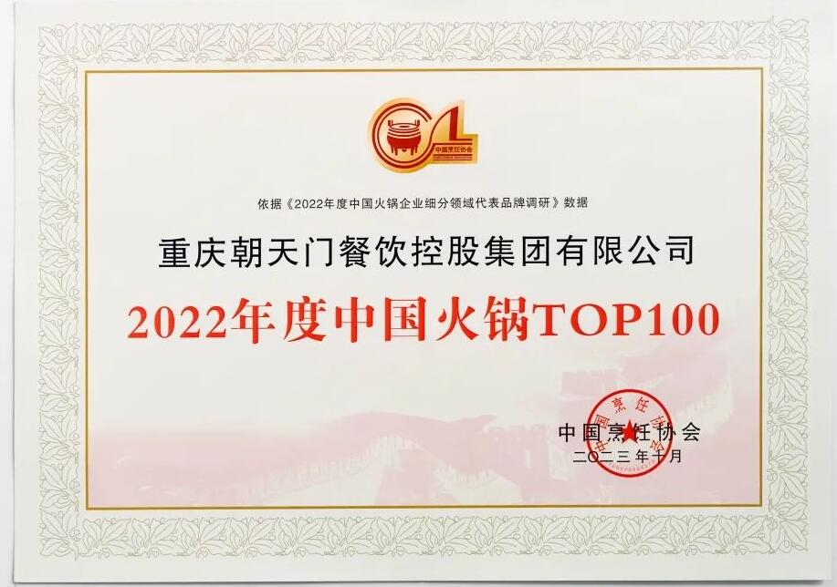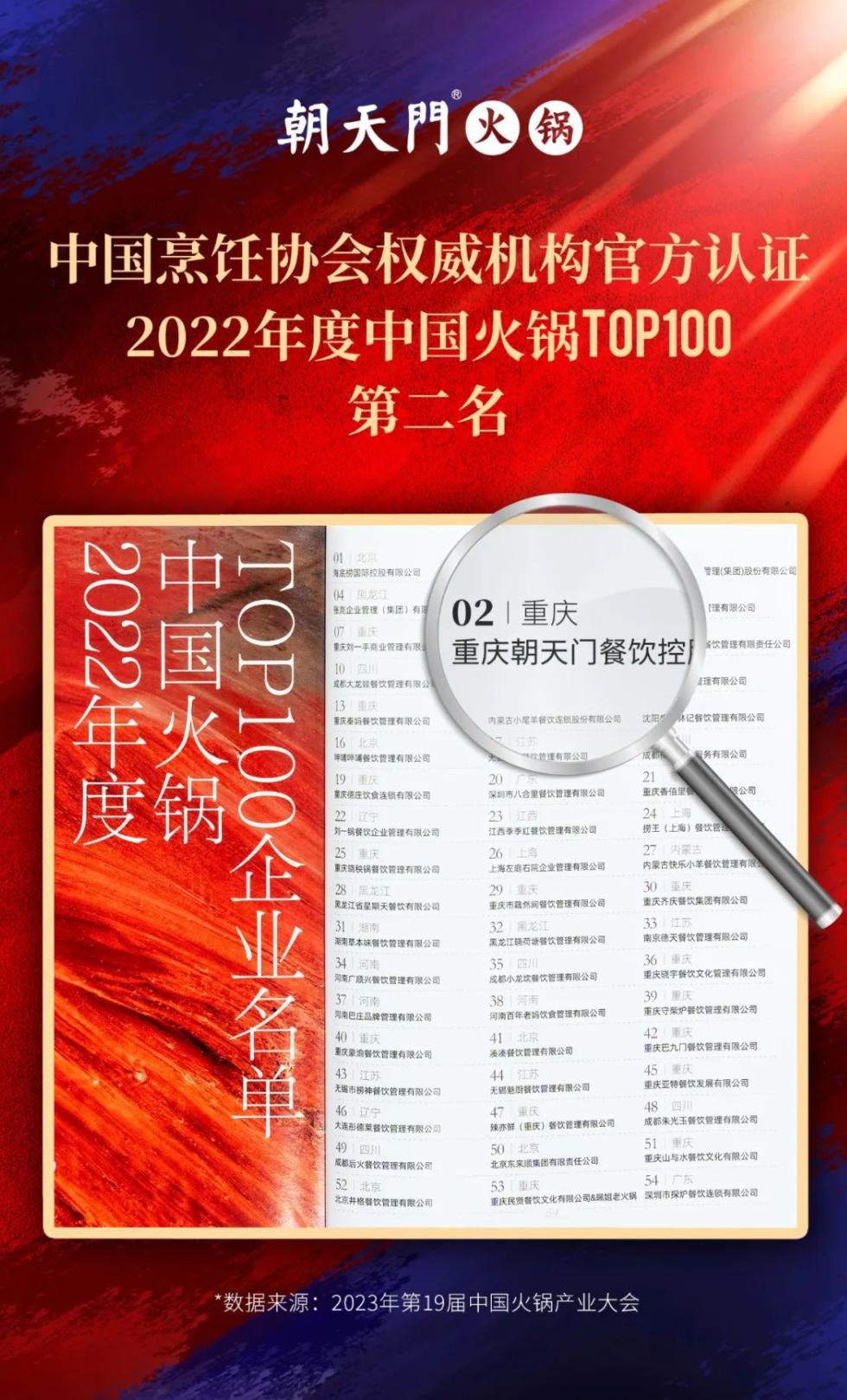 會(huì)上,由中烹?yún)f(xié)等權(quán)威機(jī)構(gòu)認(rèn)證的《中國(guó)火鍋Top100企業(yè)名單》重磅發(fā)布,朝天門餐飲控股集團(tuán)有限公司名列第二,榮獲2022年度中國(guó)火鍋Top100的頭部品牌榮譽(yù),感謝行業(yè)和顧客一直以來的監(jiān)督和支持!