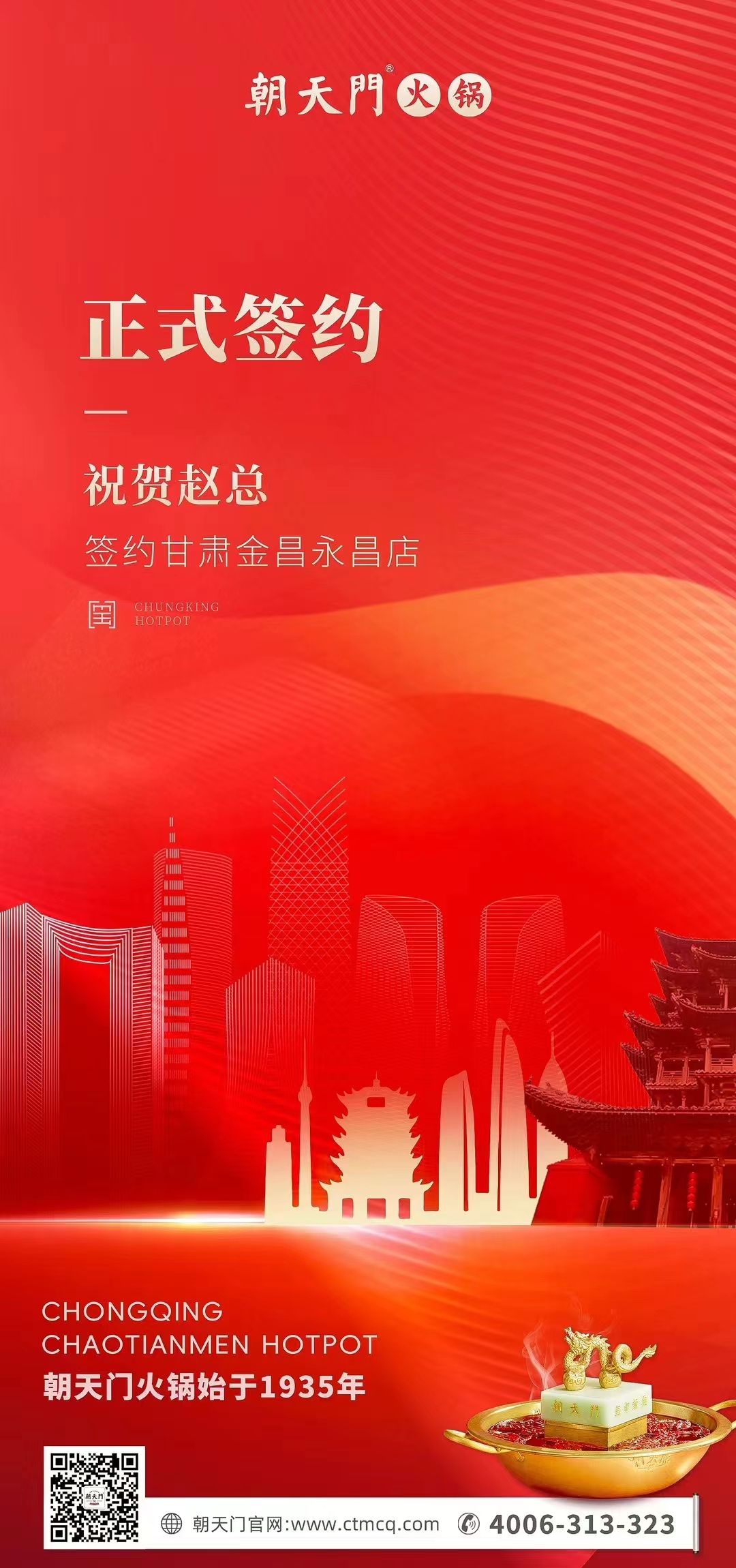 感謝趙總堅(jiān)定地選擇了朝天門(mén)火鍋,我們將誠(chéng)摯正式,朝天門(mén)倍感榮幸,會(huì)將強(qiáng)大的品牌力量,和完善的加盟系統(tǒng),賦能于甘肅金昌永昌店,相信,在趙總的精心經(jīng)營(yíng)之下,朝天門(mén)火鍋甘肅金昌永昌店生意興隆,迎四方食客!