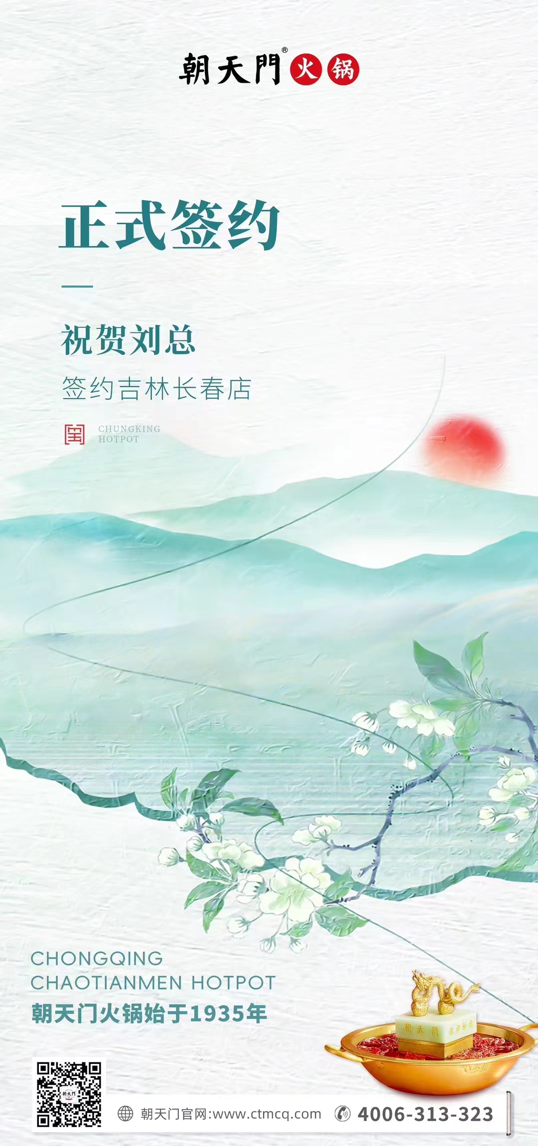 鑒于朝天門火鍋品牌優(yōu)勢,劉總堅(jiān)定地選擇了朝天門火鍋,朝天門也誠摯歡迎劉總,這樣一位優(yōu)秀可靠的合作伙伴加入朝天門大家庭,相信在我們的共同努力下,朝天門吉林長春店將在當(dāng)?shù)夭惋嬍袌龃蠓女惒剩t紅火火,生意興隆!