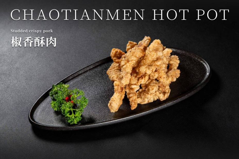 正宗重慶人在火鍋沸騰前多會(huì)點(diǎn)一份炸酥肉作開胃小吃。朝天門火鍋的「椒香酥肉」以五花肉為主料,蘸上蛋漿即炸,表面再撤上麻椒顆粒,香脆可口,味香爽麻,令人回味無(wú)窮。可即食也可放入火鍋中燙煮,吸入辣汁後肉質(zhì)香辣軟腍,雙倍滋味。