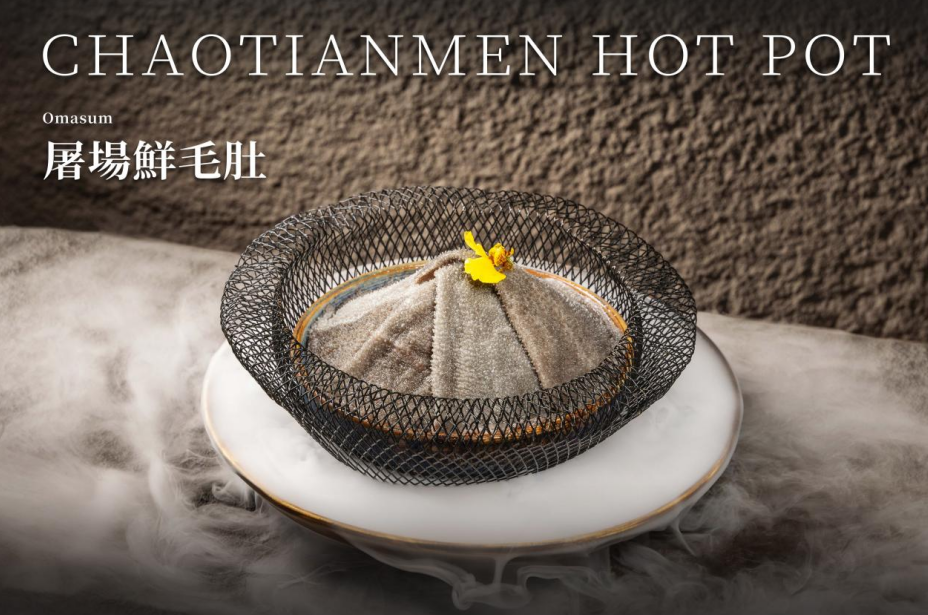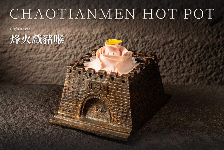 「朝天門火鍋」的菜品不少都帶有彷如頒布詔書的濃厚儀式感,如經(jīng)典菜品「手切吊龍」,上菜時(shí)用聖旨端著,非常有排場(chǎng)。吊龍是牛脊背上的一條長(zhǎng)肉,接近牛頸脊的位置,占全牛比例僅4%,為多款位置中肉味最濃的部位,油份較重,肉質(zhì)彈牙。另一道人氣菜品,將黃喉置於烽火臺(tái)之上,引經(jīng)據(jù)典取名為「烽火戲豬喉」,豪爽夠霸氣,黃喉口感爽脆彈牙,帶淡淡肉香。