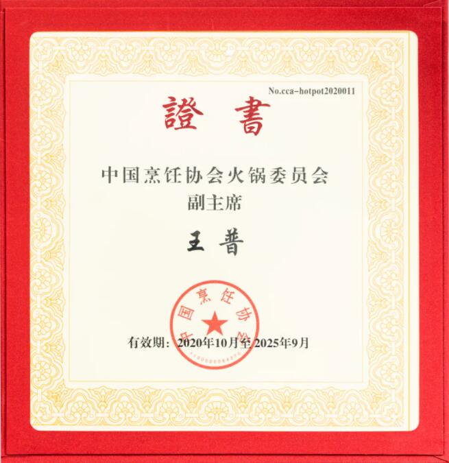 出任中國烹飪協(xié)會火鍋委員會副主席一職